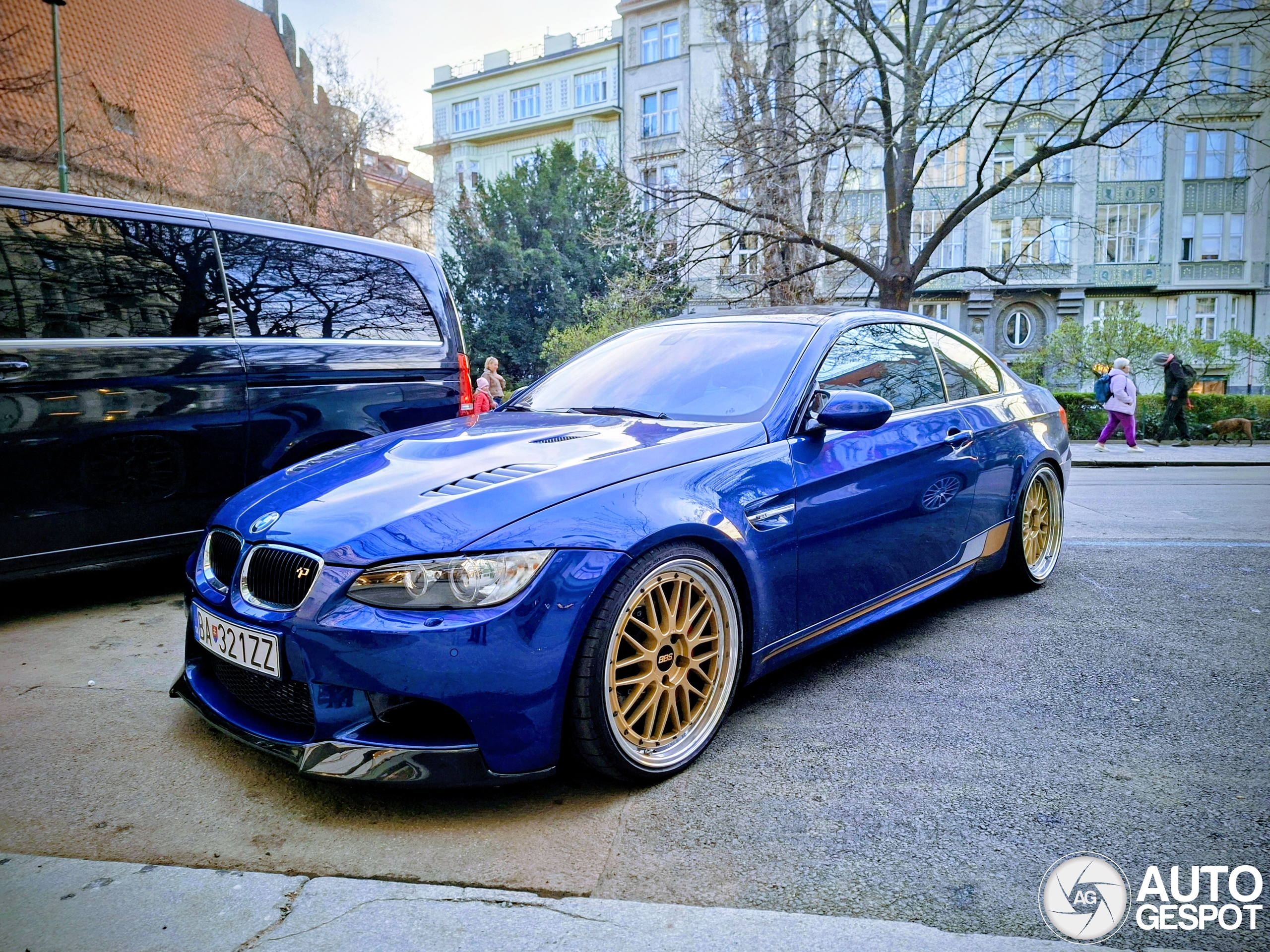 The BMW M3 E92 M500 GTR Golden Edition by Petersport is a unique masterpiece featuring significant performance and visual upgrades. Its 4.0-liter V8 engine has been tuned to produce a massive 500 HP, allowing it to reach a top speed of 340 km/h. This specific demo car is finished in a rare BMW Individual blue metallic paint complemented by custom golden BBS LM wheels. It represents the ultimate evolution of the legendary E92 M3 platform with enhanced aerodynamics and carbon fiber high-speed stability elements.